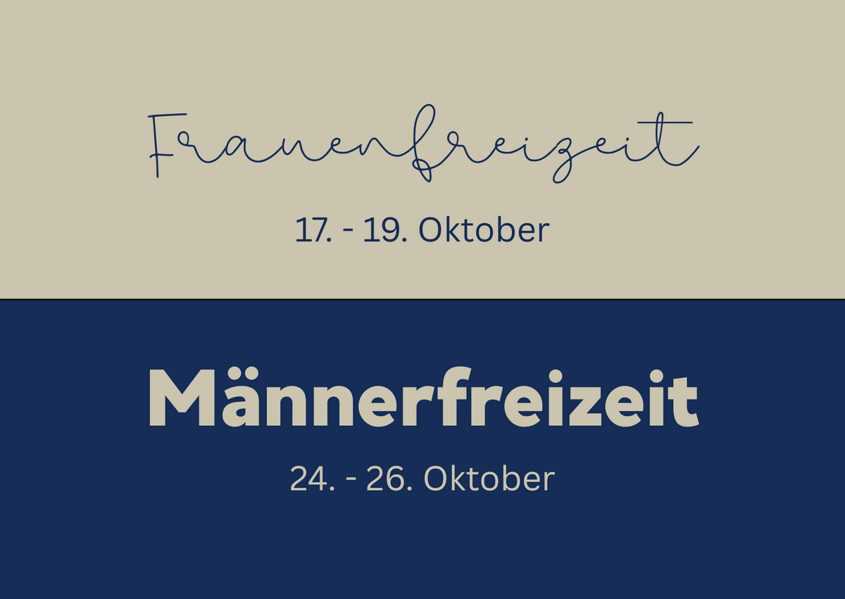 Würde dir ein Tapetenwechsel und gute Gemeinschaft gut tun? Dann melde dich auf der Frauen- bzw. auf der Männerfreizeit noch an. Es gibt noch freie Plätze.